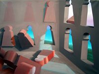 Die Bilder zum Thema "Bremer Poller", die im Kunstverein Achim zum ersten Mal öffentlich zu sehen sind, erweitern das bisher beschriebene Kompositionsschema der letzten Jahre. Der Raum erstreckt sich nicht nur auf die vordere Bildebene, sondern öffnet sich auch nach hinten. Die Negativformen der sich aus den Wänden gelöst habenden Poller geben den Blick auf das Meer, auf den Himmel und den seitlich abfallenden Horizont frei. Der Bewegungsdrang nach vorn wird auf diese Weise beruhigt, und es entsteht ein durchbrochenes Gehäuse, das sich im Zustand einer Entfaltung zu befinden scheint. Der gekrümmte Horizont und die verkürzten Linien der Architektur ergeben eine widersprüchliche Raumfolge; man könnte von einer rätselhaften Ortlosigkeit sprechen.